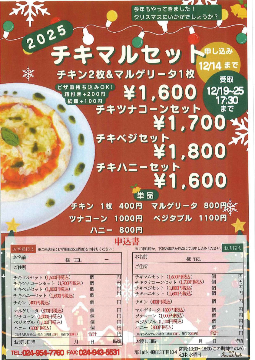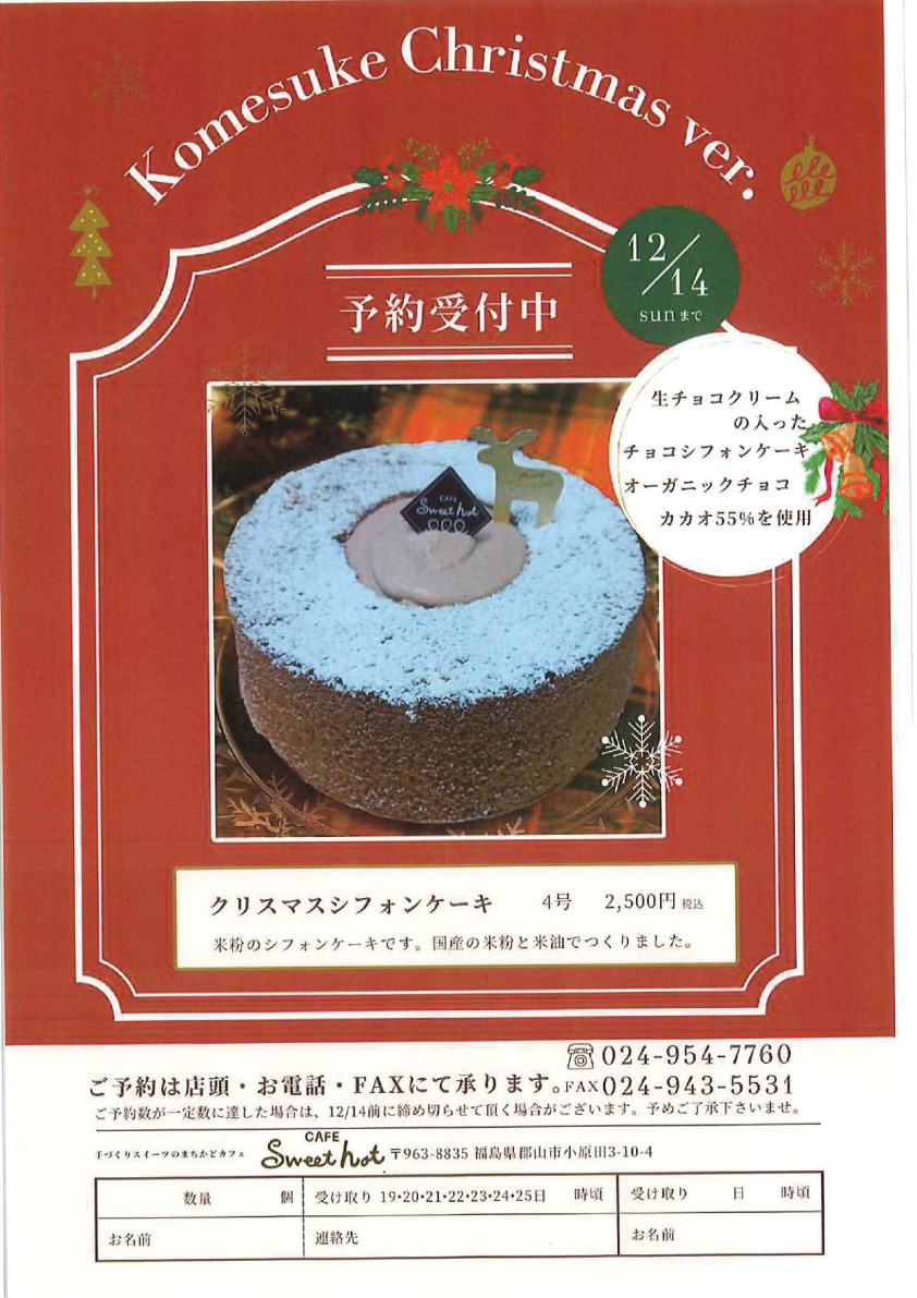 人気の「クリスマス特別セット」、「クリスマスシフォンケーキ4号」のご案内です♪